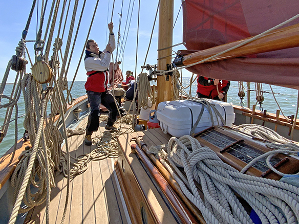 There are no winches. Traditional methods are used to raise and lower the sails, of which there are 5 that can be flown at any one time. None of the ropes are colour co-ordinated, none of them are labelled! Our experienced skipper and mate will quickly help you to get the hang of things though.